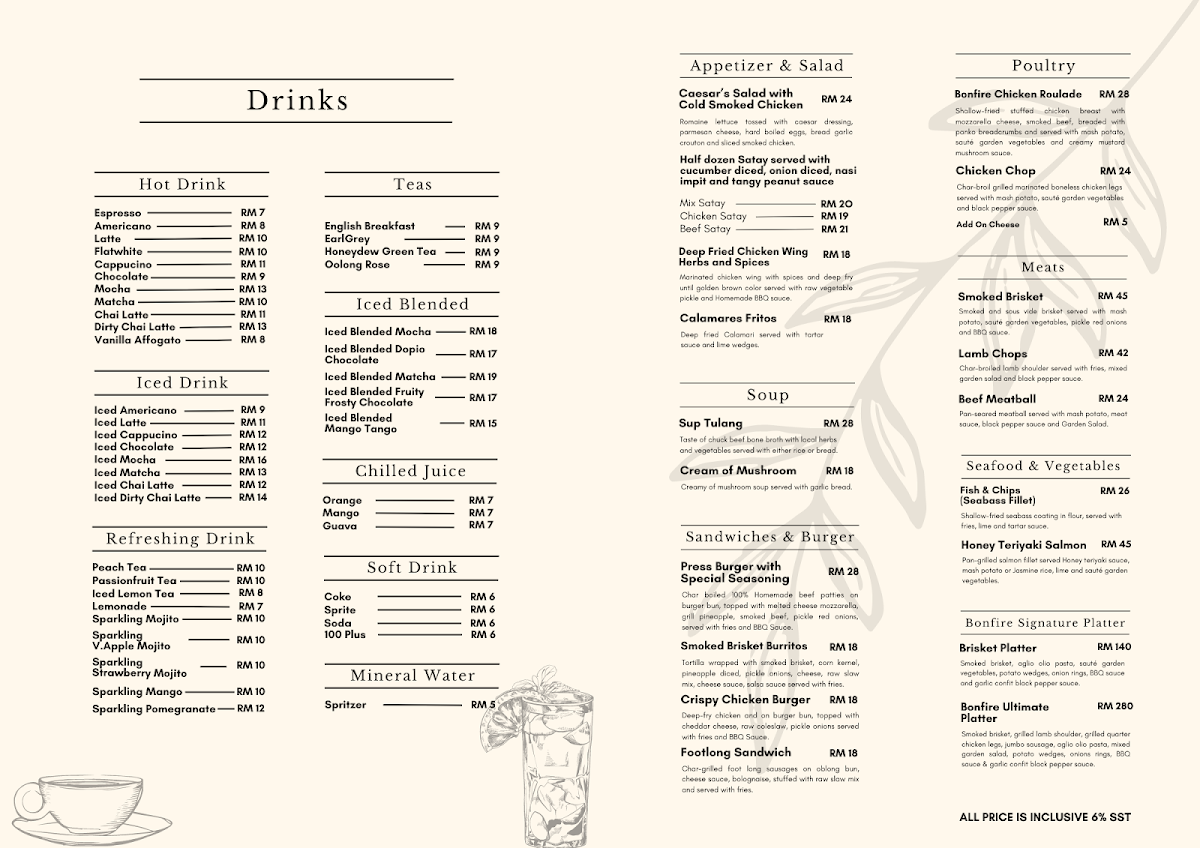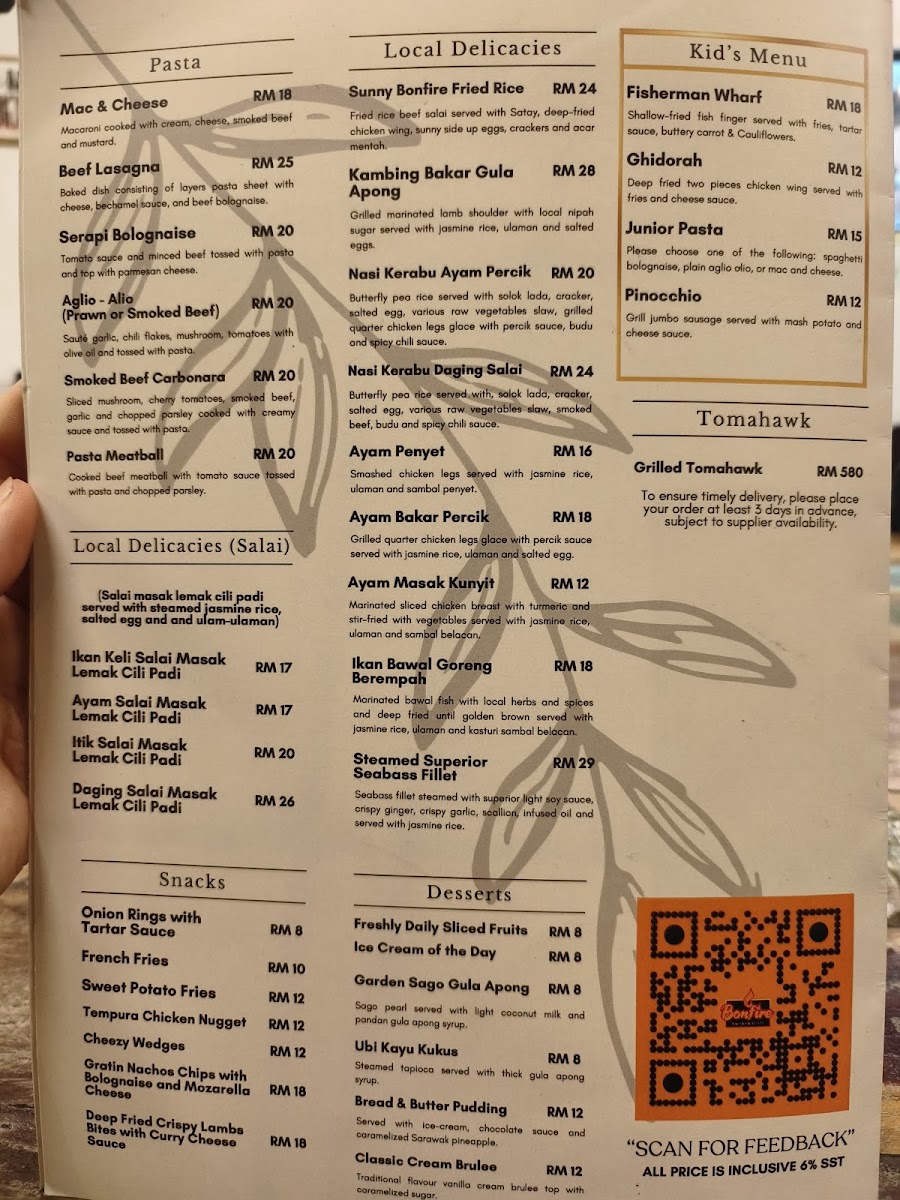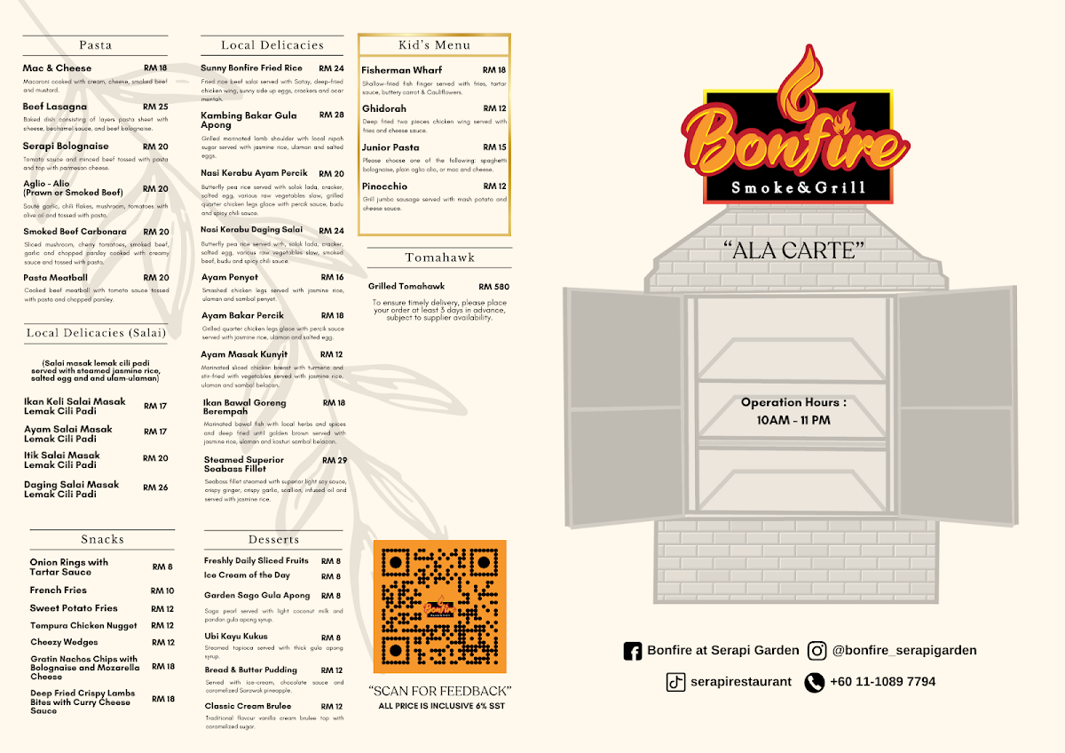 Welcome to Bonfire at Serapi Garden, a hidden gem located in Kuching, Sarawak. This charming restaurant offers a diverse menu blending Western, local, and Malay cuisines, ensuring there's something for everyone. Guests rave about the delightful Peach Strawberry Mojito and the standout Beef Brisket, perfectly smoked and served with rich gravy. The Lamb Chop is another must-try, well-executed and flavorful.